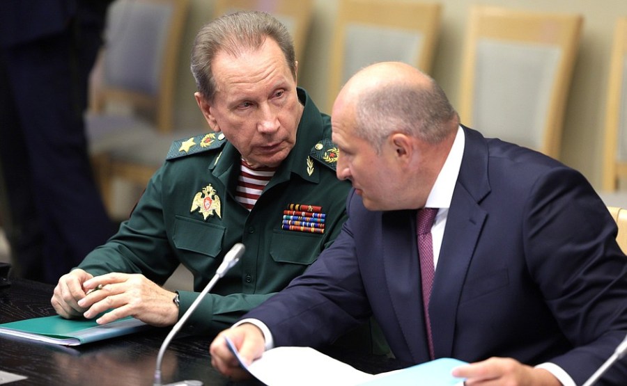 1 Vladimir Poutine a tenu une réunion sur les questions d’actualité à Novo-Ogaryovo. Directeur du Service fédéral des troupes de la Garde nationale – Commandant en chef des troupes de la Garde nationale Viktor Zolotov (à gauche) et ministre de la Défense civile, des Urgences et des secours en cas de catastrophe naturelle, Alexander Kurenkov, avant la réunion.