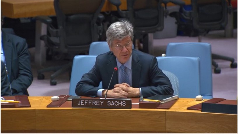 Je m’appelle Jeffrey D. Sachs. Je suis professeur à l’Université de Columbia. Je suis spécialiste de l’économie mondiale et du développement durable. Je comparais devant le Conseil de sécurité de l’ONU en mon propre nom. Je ne représente aucun gouvernement ou organisation dans le témoignage que je vais livrer.