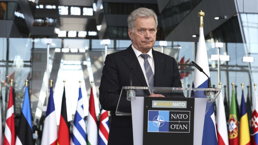 Le président finlandais Sauli Niinistö s’adresse aux médias avant une cérémonie de lever du drapeau en marge d’une réunion des ministres des Affaires étrangères de l’Otan au siège de l’organisation à Bruxelles, ce mardi 4 avril 2023. AP – Geert Vanden Wijngaert