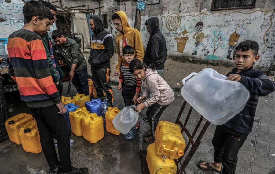 Des enfants palestiniens attendent avec des jerrycans pour les remplir d’eau potable à Rafah, le 19 février 2024. – ABED RAHIM KHATIB / PICTURE ALLIANCE VIA GETTY IMAGES