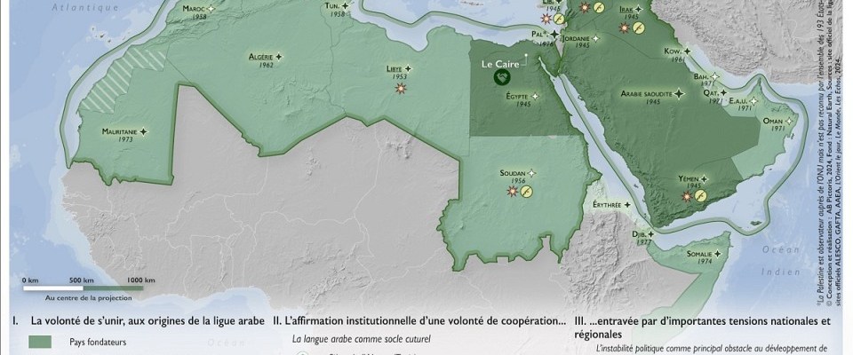 La Ligue arabe a rendu possible une accélération et un approfondissement de la coopération entre les pays arabes qui la constituent. Néanmoins, cet objectif de solidarité arabe régionale est constamment mis à l’épreuve par les nombreux foyers de tensions et crises persistantes. Cela a largement tendance à reléguer au second plan la coopération régionale. Une carte commentée.