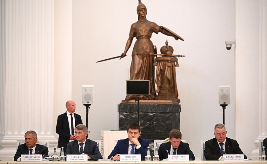 20 sur 23 Réunion élargie du Présidium du Conseil d’État sur le développement des exportations. De gauche à droite : le gouverneur de la région de Tcheliabinsk, président de la Commission du Conseil d’État sur l’économie et les finances, Alexei Teksler, le maire de Moscou, le président de la Commission du Conseil d’État sur l’administration d’État et municipale Sergueï Sobianine, le gouverneur de Sébastopol, président de la Commission du Conseil d’État sur la culture et la spiritualité et la morale traditionnelles. Valeurs Mikhaïl Razvozhayev. Photo : Grigori Sisoev, RIA Novosti