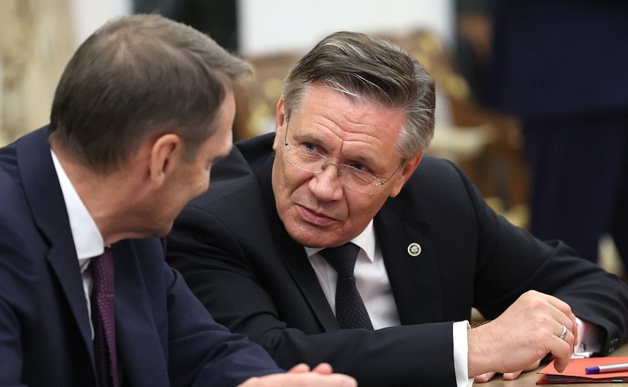 2 sur 8 Le directeur général de Rosatom, Alexei Likhachev (à droite) et le directeur des services de renseignement étrangers, Sergueï Narychkine, avant la réunion de la conférence permanente du Conseil de sécurité sur la dissuasion nucléaire.