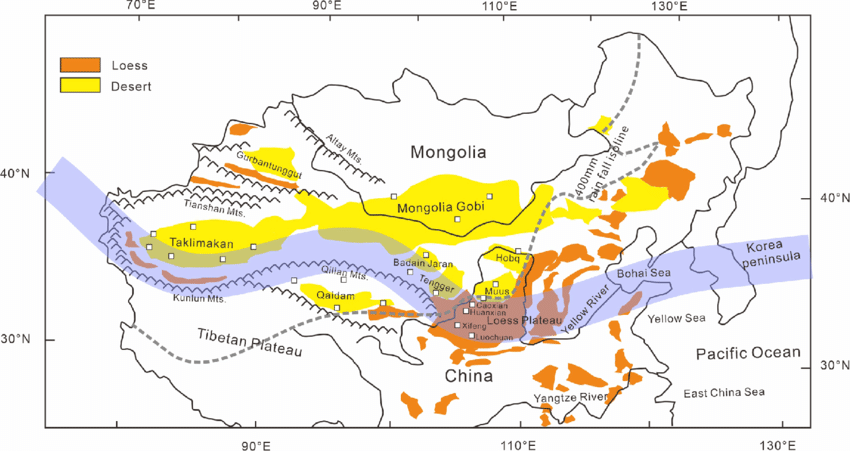 carte 2 Répartition des déserts en Chine. En bleu, la zone de circulation des vents.