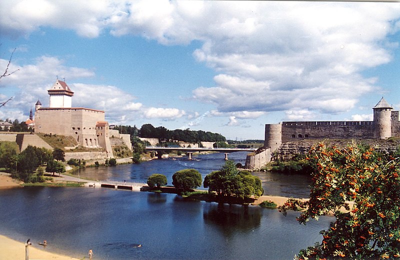 Sur le trottoir d’autres bus venus de Tallinn, de Riga et même de Varsovie se garaient et d’autres candidats au passage vers la Russie patientaient. Je cherchais les véhicules russes. Aucun ne venait jusqu’ici pour prendre leurs passagers. Car, avant de s’y installer, il fallait « franchir le pont », c’est-à-dire la frontière. En effet depuis le début de la guerre, ce pont n’était plus que piétonnier. La Narva n’étant pas bien large, environ 300 mètres, emprunter ce pont n’était pas bien difficile. Les bus pour Saint-Pétersbourg attendaient sur l’autre rive. Pour mieux observer la chose, je pensais devoir me « risquer » plus loin, directement sur la rive Ouest du fleuve : « les barbelés, les tours de contrôle, les soldats avec leur gilets pare-balles » etc. etc….mais non, l’idée même de risque semblait risible et, descendant la rue qui menait vers le fleuve, juste en dessous des premiers contreforts du pont qui l’enjambait, je ne rencontrais que des badauds profitant du soleil, des couples assis sur quelques bancs publics, des mamans poussant de vieux landaus qui auraient fait la joie d’antiquaires parisiens, des jeunes glissant sur leurs skates, des familles avec gros et petits chiens et même des baigneurs se jetant allègrement dans l’eau avec dans leur dos le château fort de leur ville et en face, côté russe, la forteresse d’Ivangorod. A pied de celle-ci, en Russie à présent si proche, des pécheurs à la ligne profitaient tout autant du soleil.