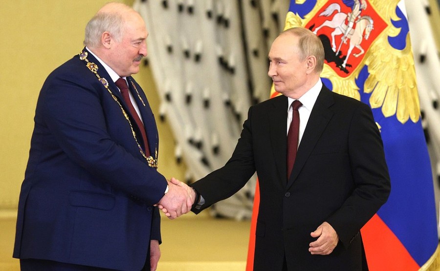 Vladimir Poutine a remis l’Ordre de Saint-André, Apôtre le Premier Appelé, la plus haute décoration d’État de la Fédération de Russie, au Président de la République de Biélorussie Alexandre Loukachenko lors d’une cérémonie qui s’est tenue dans la salle Saint-André du Grand Palais du Kremlin.