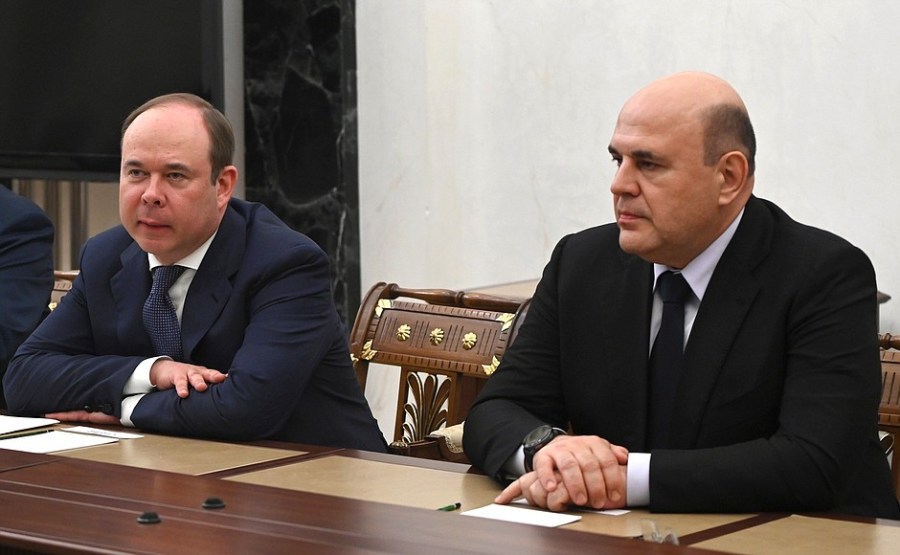 Le chef de cabinet du bureau exécutif présidentiel Anton Vaino (à gauche) et le Premier ministre Mikhaïl Mishustin avant la réunion avec les membres permanents du Conseil de sécurité.