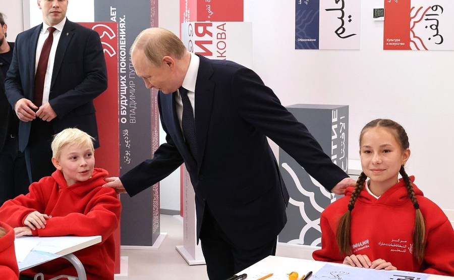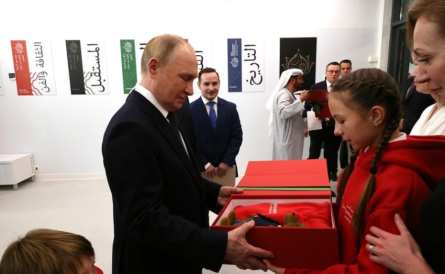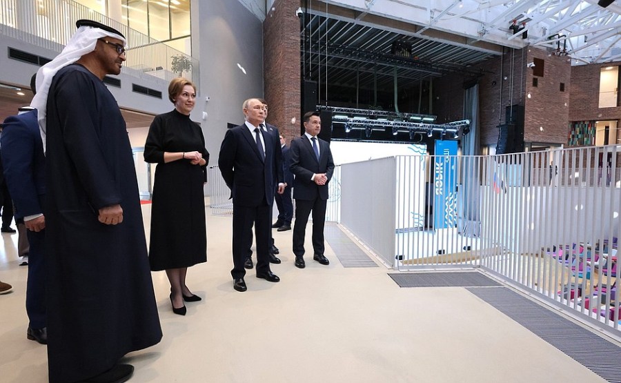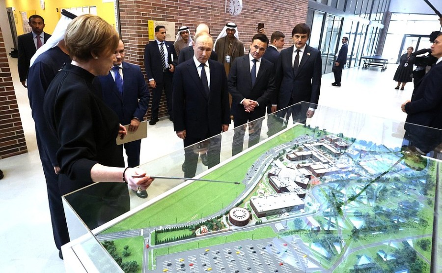 Vladimir Poutine et le président des Émirats arabes unis Mohammed ben Zayed Al Nahyan ont participé à la cérémonie d’ouverture du Centre de coopération internationale en matière d’éducation Cheikha Fatima bint Moubarak avec les Émirats arabes unis au gymnase Eugène Primakov dans la région de Moscou.