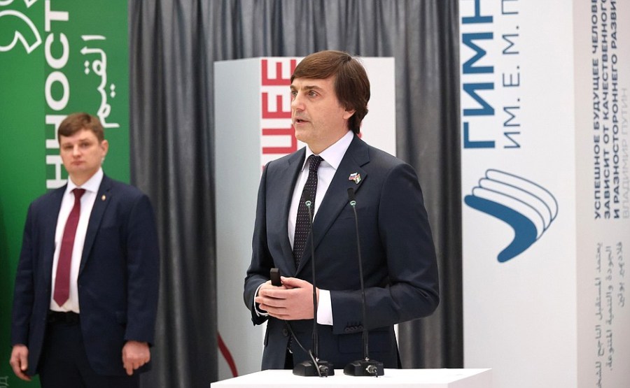 Le ministre russe de l’Éducation Sergueï Kravtsov lors de la cérémonie d’ouverture du Centre de coopération internationale en matière d’éducation avec les Émirats arabes unis au gymnase Eugène Primakov. Photo : Sergueï Karpoukhine, TASS