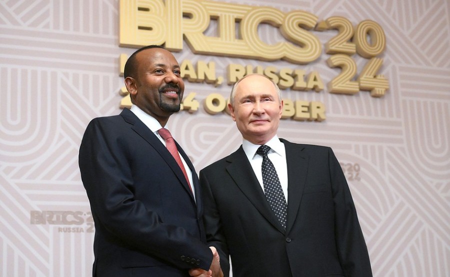 Lors de la cérémonie d’accueil des chefs des délégations des pays BRICS. Avec le Premier ministre éthiopien Abiy Ahmed. Photo par : Grigoriy Sysoyev, brics-russia2024.ru Agence photo hôte