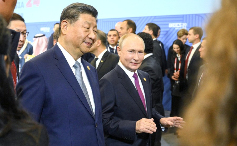 1 sur 23 Avant la séance plénière BRICS Plus/Outreach lors du 16e Sommet des BRICS. Avec le président de la République populaire de Chine Xi Jinping. Photo par : Stanislav Krasilnikov, brics-russia2024.ru Agence photo hôte