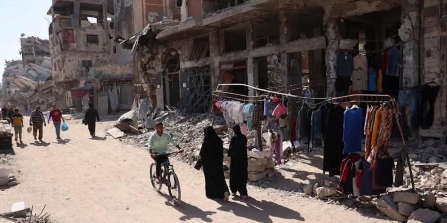 Des Palestiniens passent devant un portant de vêtements installé face à un bâtiment endommagé à Khan Younès, dans le sud de la bande de Gaza, le 29 octobre 2024. Bashar Taleb/AFP