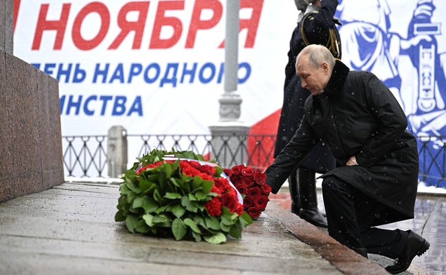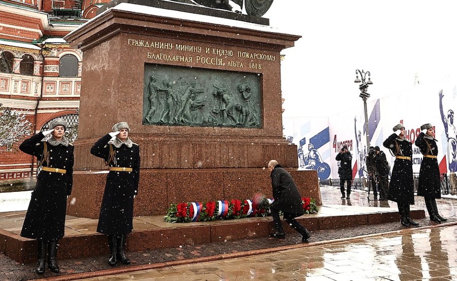 À l’occasion de la Journée de l’unité nationale, Vladimir Poutine a déposé des fleurs devant le monument dédié à Kouzma Minine et à Dmitri Pojarski sur la Place Rouge.
