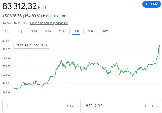 Le bitcoin, qui vient de dépasser le seuil des 90.000 dollars, même si désormais il recule un peu, il n’en reste pas moins que la progression est fulgurante depuis l’élection de Donald Trump qui a dit et déclaré qu’il protègerait les cryptomonnaies et les favoriserait.