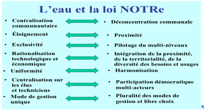 La loi n° 2015-991 du 7 août 2015 portant Nouvelle organisation territoriale de la République (NOTRe) prévoit le transfert obligatoire des compétences eau et assainissement à l’ensemble des établissements publics de coopération intercommunale (EPCI) à fiscalité propre d’au moins 15.000 habitants.
