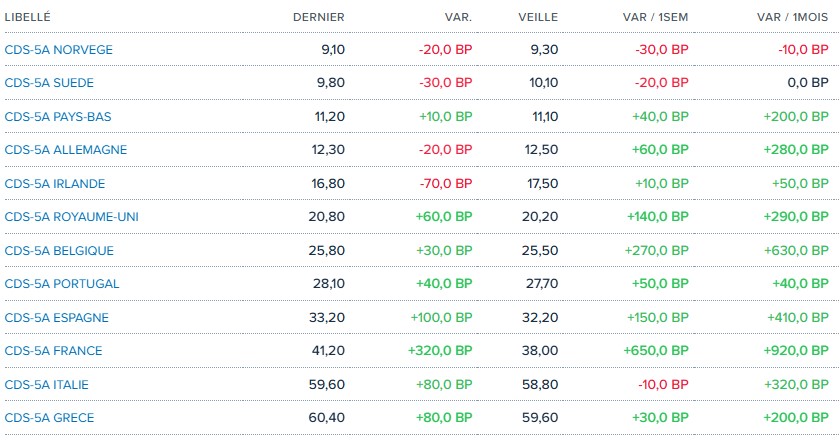 Regardez-ci-dessous l’évolution des CDS de la France, dernière colonne sur un mois. C’est chez nous que cela augmente le plus.