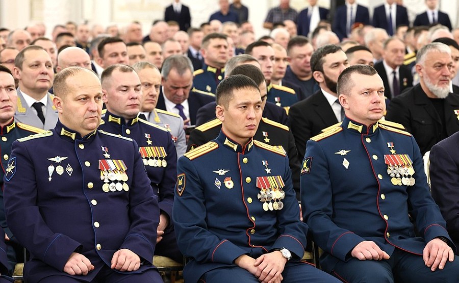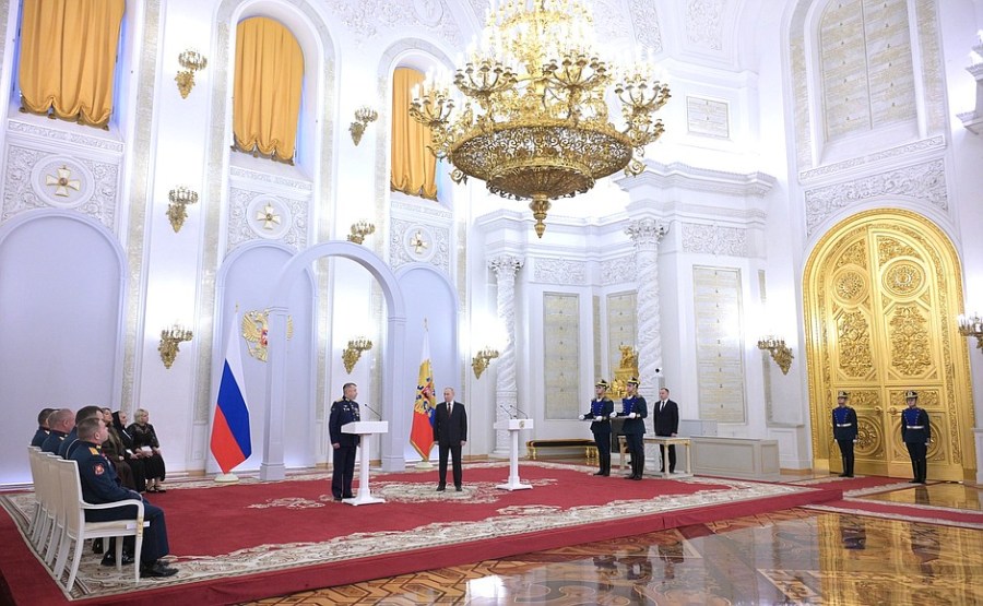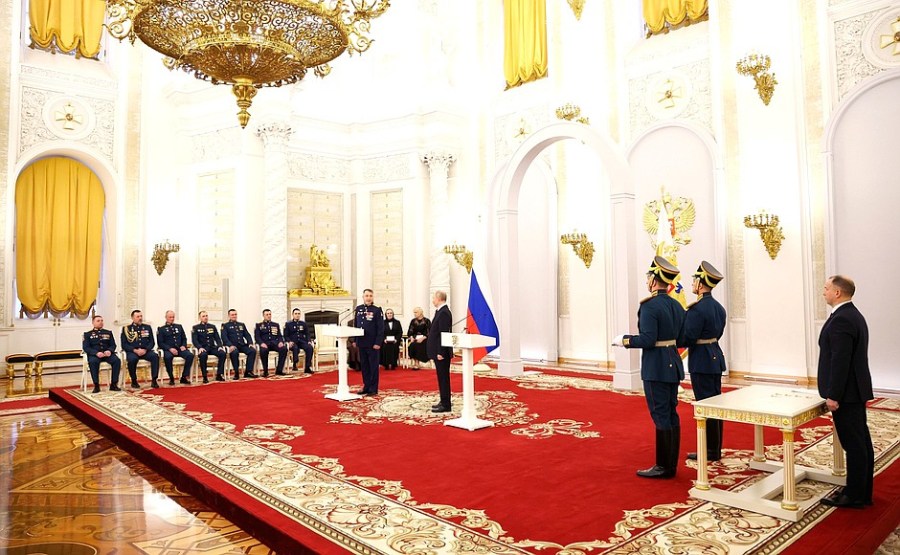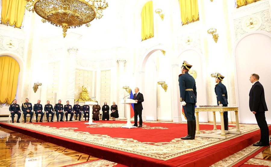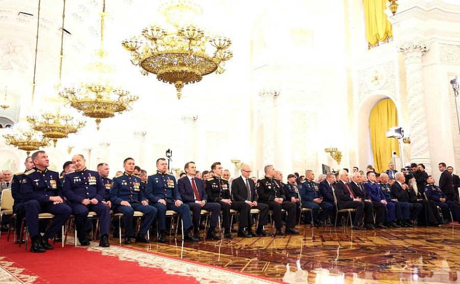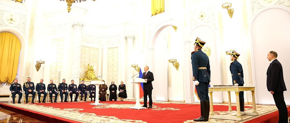 À l’occasion de la Journée des Héros de la Patrie, une cérémonie de remise des médailles de l’Étoile d’or aux Héros de Russie a eu lieu dans la salle Saint-Georges du Grand Palais du Kremlin.