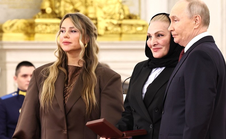 9 sur 15 Lors de la cérémonie de remise des médailles Gold Star aux Héros de Russie. Vladimir Poutine remet la décoration décernée au lieutenant Mikhaïl Izbakiyev à sa mère, Marina Izbakiyeva, et à sa veuve, Anna Mitkova.