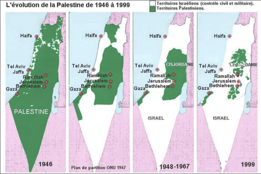 Cartes simplifiées qui montrent l’évolution du conflit territorial. Les territoires palestiniens rétrécissent, et en parallèle les territoires sous contrôle israélien s’élargissent Source : https://www.flickr.com/photos/43405897@N04/4055313294