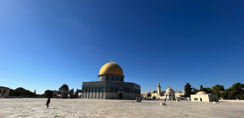 L’esplanade des Mosquées/Mont du Temple à Jérusalem (Voir Lexique en pied de page). Troisième lieu saint de l’Islam, sur laquelle se trouve la Mosquée Al-Aqsa et le Dôme du rocher. Selon la tradition musulmane c’est l’emplacement où Mahomet se serait élevé au ciel. Selon la tradition juive c’est l’emplacement où se situaient le Temple de Salomon, puis le Temple d’Hérode, dont il ne resterait plus que le mur des lamentations. Septembre 2023. Crédit Marie Durrieu.