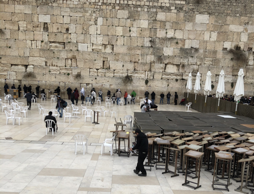 Le mur des lamentations au cœur de la vieille ville de Jérusalem. Lieu le plus saint pour la religion juive et qui serait le seul vestige du Temple d’Hérode. Surplombé par l’esplanade des Mosquées/Mont du temple (Voir Lexique en pied de page). Janvier 2020. Crédit Marie Durrieu.