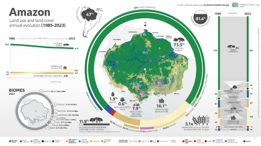 MapBiomas, une coalition d’ONG, dénonce le poids important de l’agriculture dans la déforestation amazonienne (cf. infographie). Selon ses études5, la forêt d’Amazonie a perdu presque 100 millions d’hectares (Mha) depuis 1985 (707 Mha en 1985 pour 619 Mha en 2023), et a vu son espace occupé par l’agriculture devenir 3,1 fois plus important sur la même période (43 Mha en 1985 pour 135 Mha en 2023).