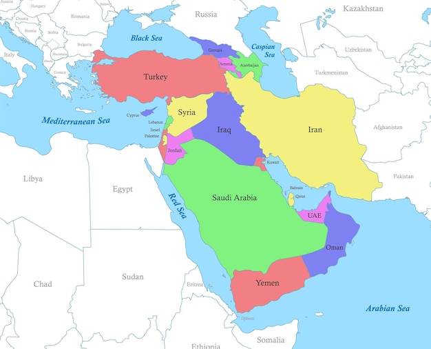 West Asia Region. Map of countries in western Asia or Middle East. Vector illustration.