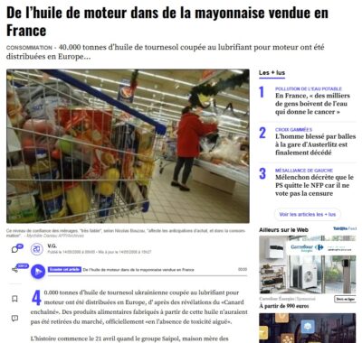 “40.000 tonnes d’huile de tournesol ukrainienne coupée au lubrifiant pour moteur ont été distribuées en Europe, d’ après des révélations du «Canard enchaîné». Des produits alimentaires fabriqués à partir de cette huile n’auraient pas été retirées du marché, officiellement «en l’absence de toxicité aiguë».