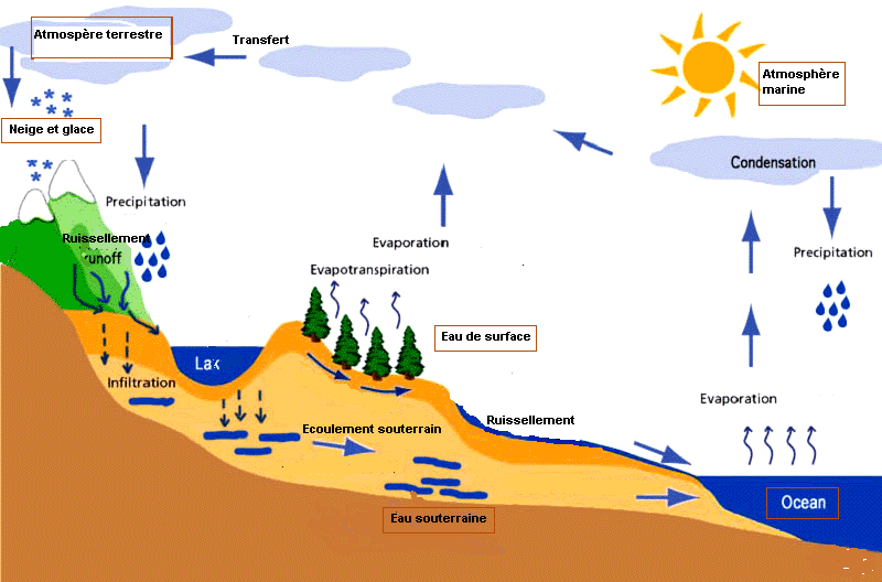 L’évapotranspiration de l’eau part des terres et des masses d’eau, puis est transportée, condensée et finalement précipitée à nouveau sur la surface de la Terre.