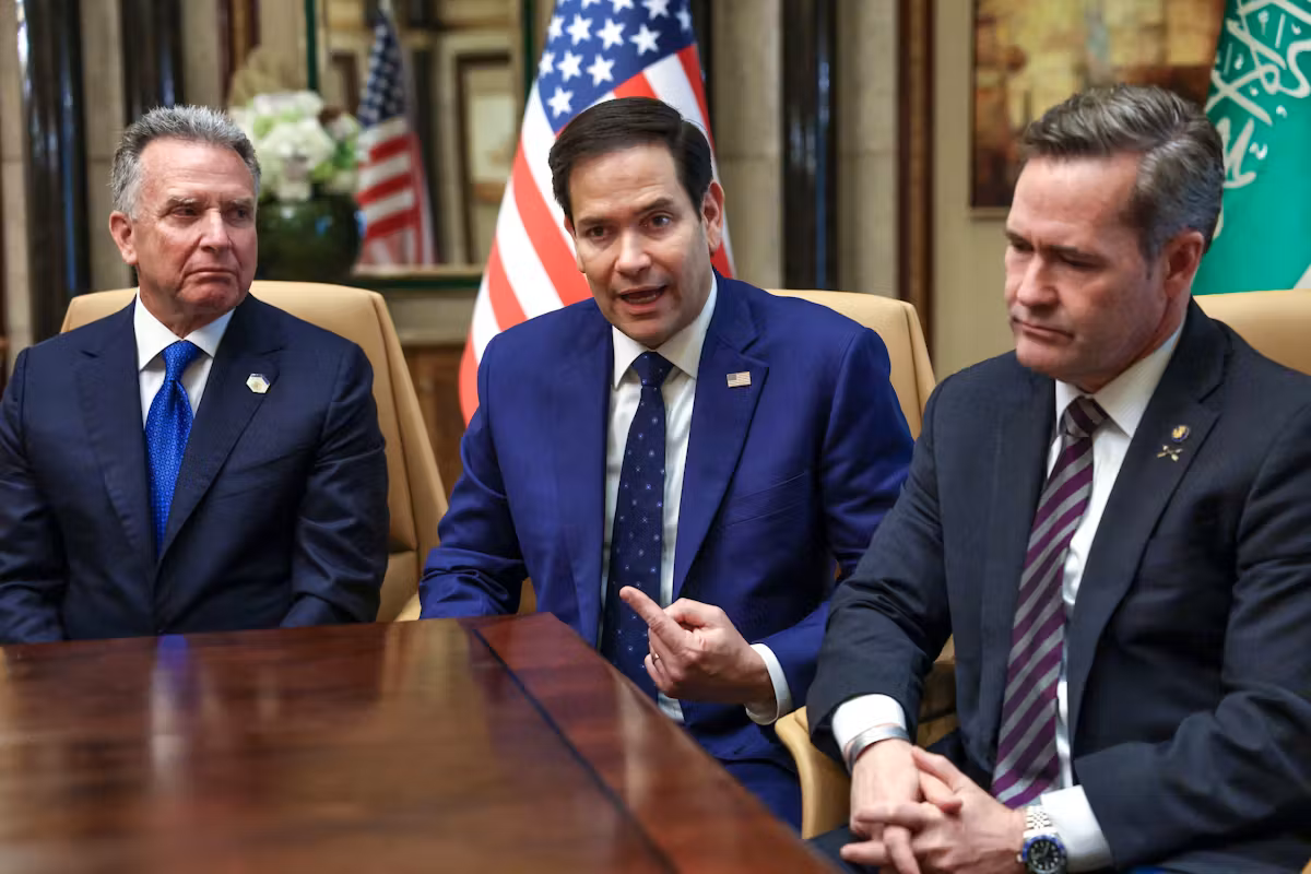 Le secrétaire d’État américain Marco Rubio (au centre), le conseiller à la sécurité nationale, Mike Waltz (à droite) et l’envoyé spécial pour le Moyen-Orient Steve Witkoff