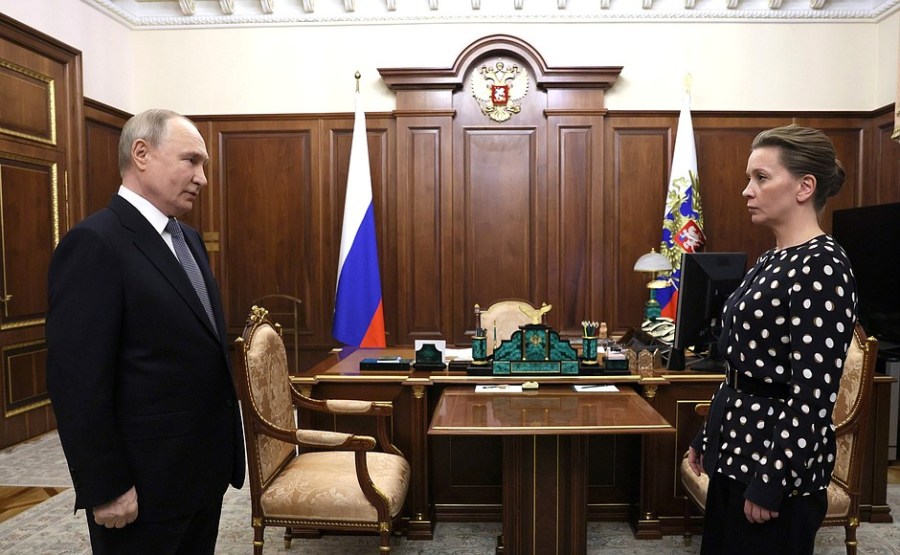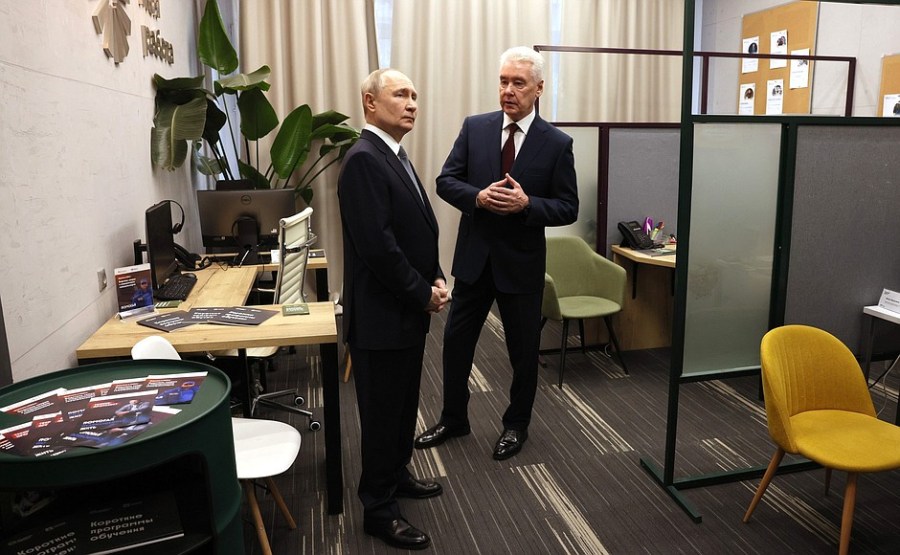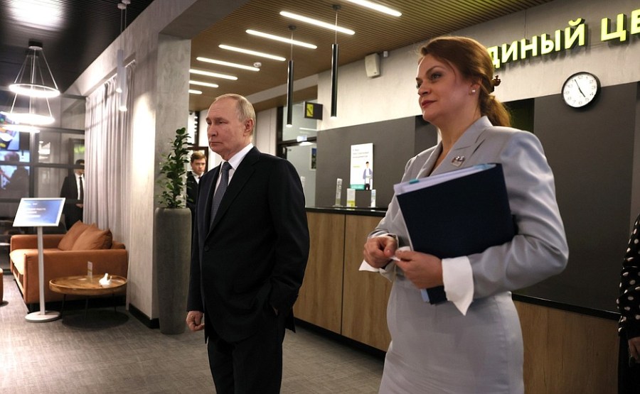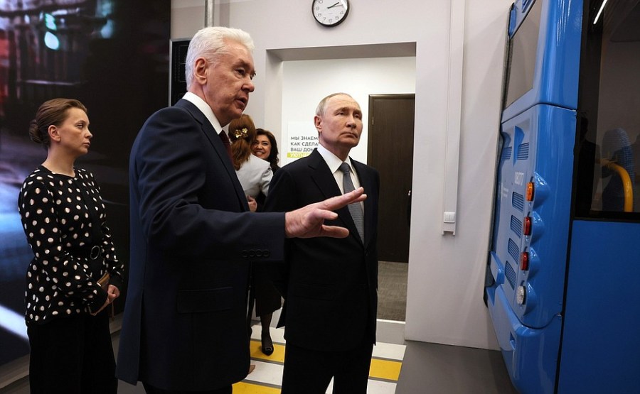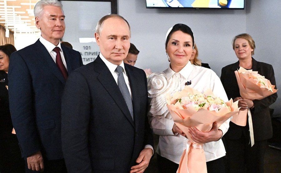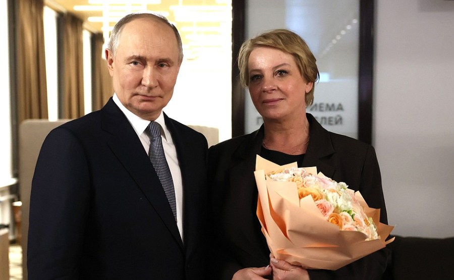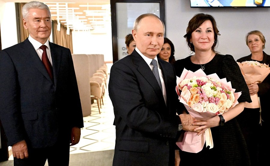 du maire de Moscou, Sergei Sobyanin, du secrétaire d’État – ministre adjoint de la Défense et présidente des défenseurs de la Fondation de la Père Anna Tsivileva, et Olga Chebneva, la veuve du héros de la Russie Sergei Chebnev, avec qui le président s’est rencontré séparément au Kremlin avant de visiter le Centre.