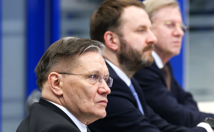 Cérémonie pour lancer des expéditions de charbon à partir du terminal de transbordement Lavna (tenue par vidéoconférence). Le directeur général de Rosatom Alexei Likhachev, chef d’état-major adjoint du bureau exécutif présidentiel Maxim Oreshkin et adjoint Vitaly Savelyev (de gauche à droite). Photo: Sergei Karpukhin, Tass