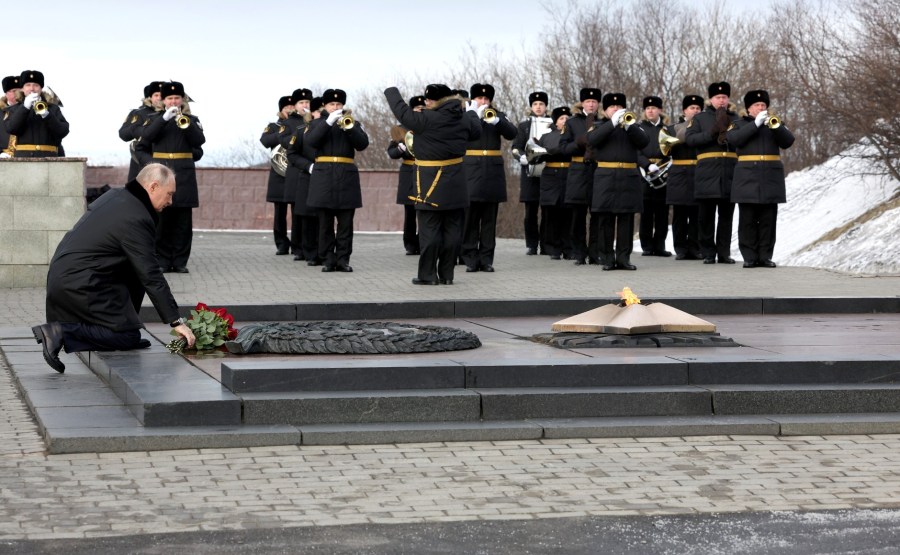 Vladimir Poutine posant des fleurs au monument aux défenseurs de l’Arctique soviétique pendant la grande guerre patriotique.