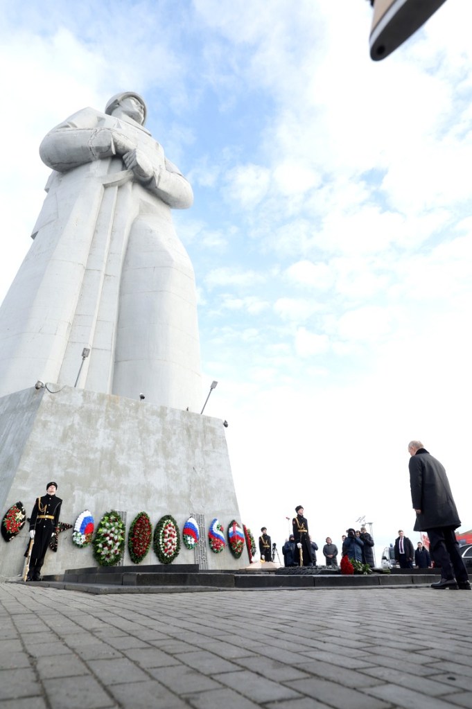 Le voyage de travail de Vladimir Poutine à Murmansk a commencé par une visite au Mémorial des Défenseurs de l’Arctique où le président a posé des fleurs au monument soviétique de la grande guerre patriotique.
