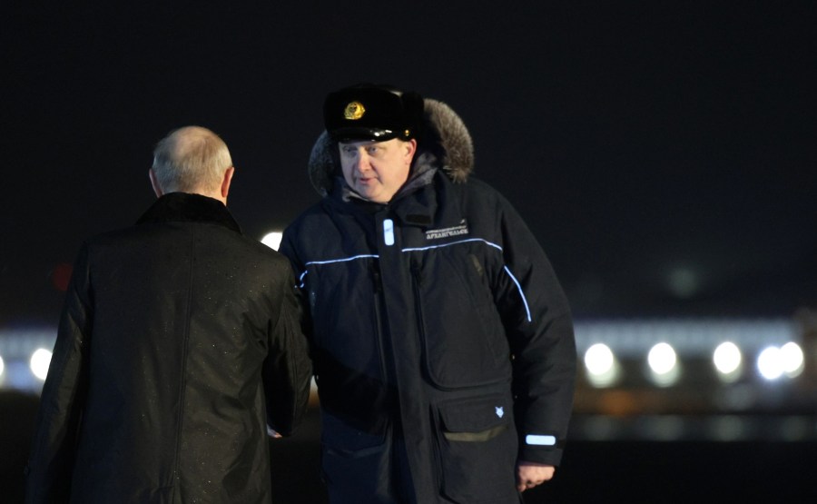 Vladimir Poutine est arrivé à Mourmansk. Avec Alexander Gutsan, envoyé plénipotentiaire présidentiel dans le district fédéral du Nord-Ouest, et le gouverneur de la région de Mourmansk, Andrei Chibis, à droite. Photo: Andrey Gordeyev, Vedomosti