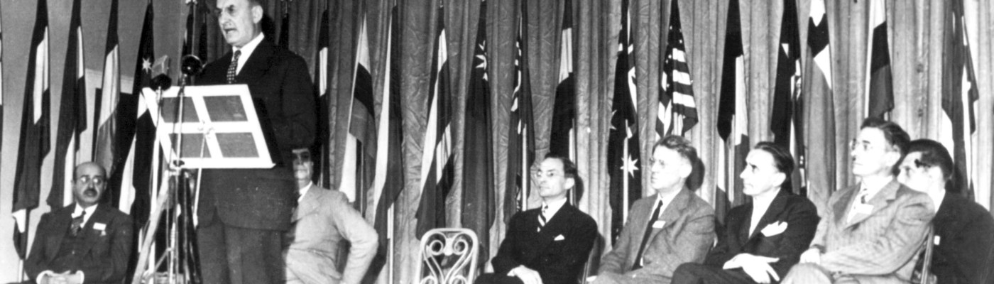 An undated handout photo of U.S. Secretary of the Treasury Henry Morgenthau, left, addresses the Bretton Woods Conference, where the International Monetary Fund as created. Unknown to historians, a transcript existed of the meeting of Allied nations during the heat of World War II and three versions were in Washington-area libraries and archives. –photo au plan White américain lors de la conférence de Bretton Woods.