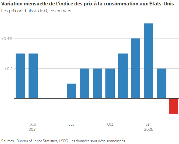 Voici ce que dit l’Agence de presse Reuters. “Les prix à la consommation aux Etats-Unis ont chuté de manière inattendue en mars, grâce à la baisse des prix de l’essence et des véhicules d’occasion, mais cette inflation modérée ne devrait pas se maintenir après que le président Donald Trump a doublé les droits de douane sur les produits chinois importés.