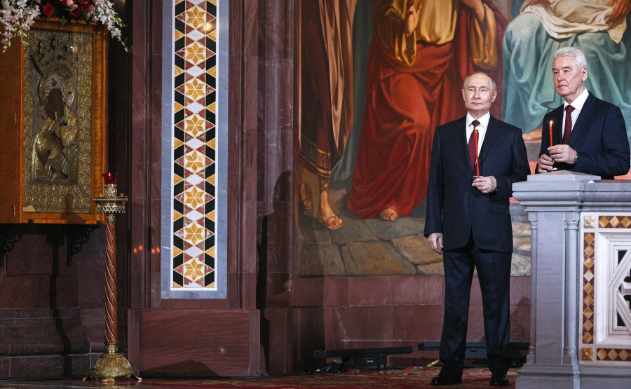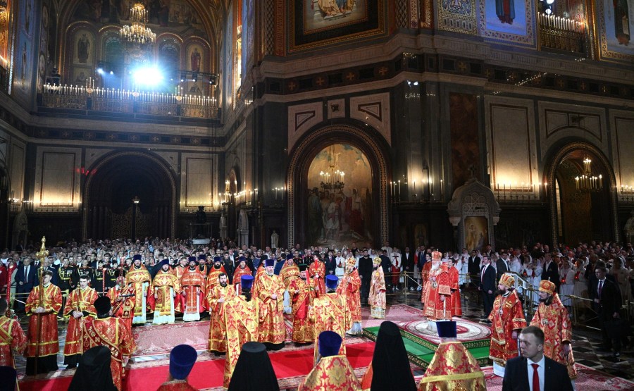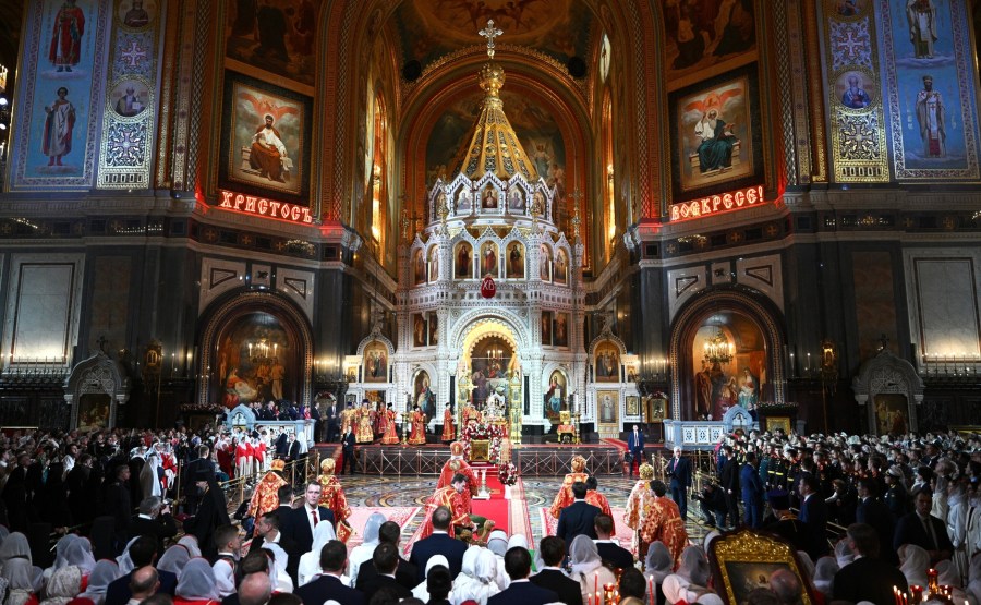 Vladimir Poutine et le maire de Moscou, Sergueï Sobianine, ont assisté à la veillée pascale à la cathédrale du Christ-Sauveur. L’office divin a été célébré par le patriarche Cyrille de Moscou et de toute la Russie.