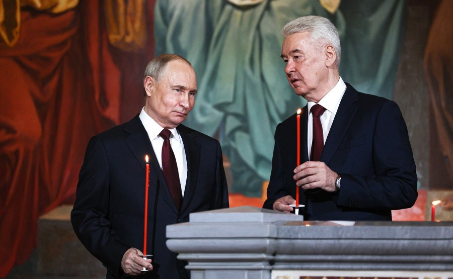 Avec le maire de Moscou, Sergei Sobyanin au service de Pâques à la cathédrale du Christ Sauveur. Photo de Sergei Bulkin, Tass