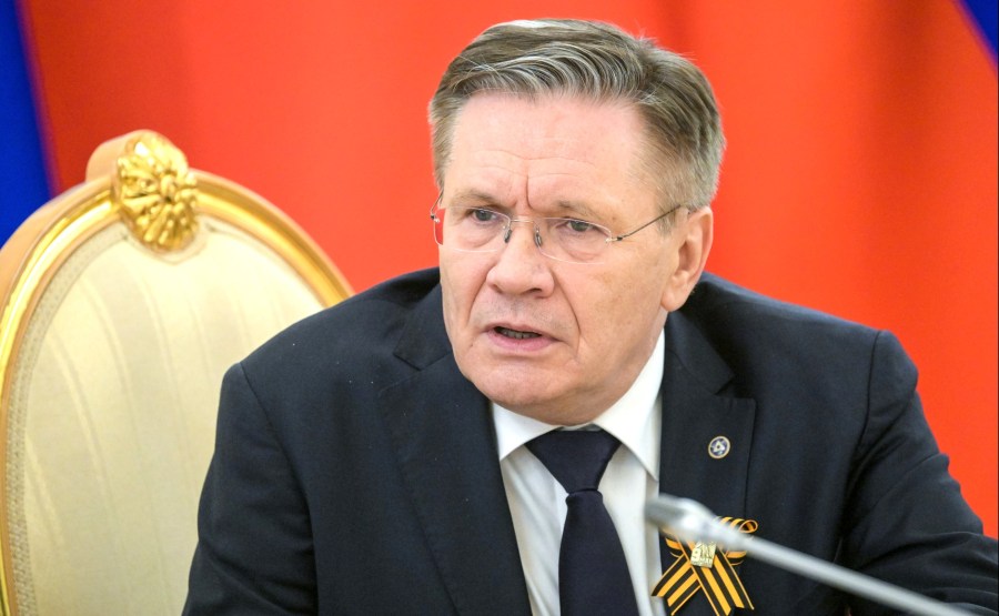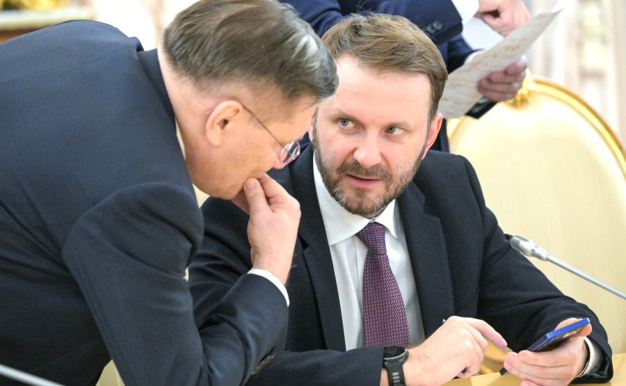Directeur général d’État Atomic Energy Corporation Rosatom Alexei Likhachev et chef d’état-major du bureau exécutif présidentiel Maxim Oreshkin avant la réunion avec le président de la Mongolie Ukhnaagiin Khurelsukh. Photo: Alexei Nikolskiy, Ria Novosti