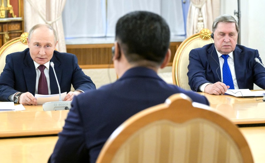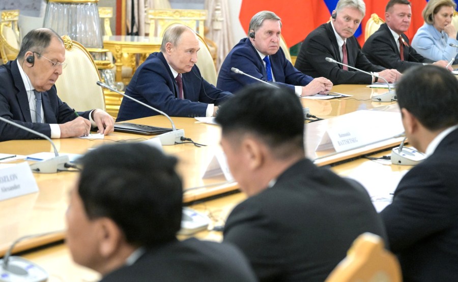 Avec l’aide présidentielle Yury Ushakov lors de la réunion avec le président de la Mongolie Ukhnaagiin Khurelsukh. Photo: Alexei Nikolskiy, Ria Novoti