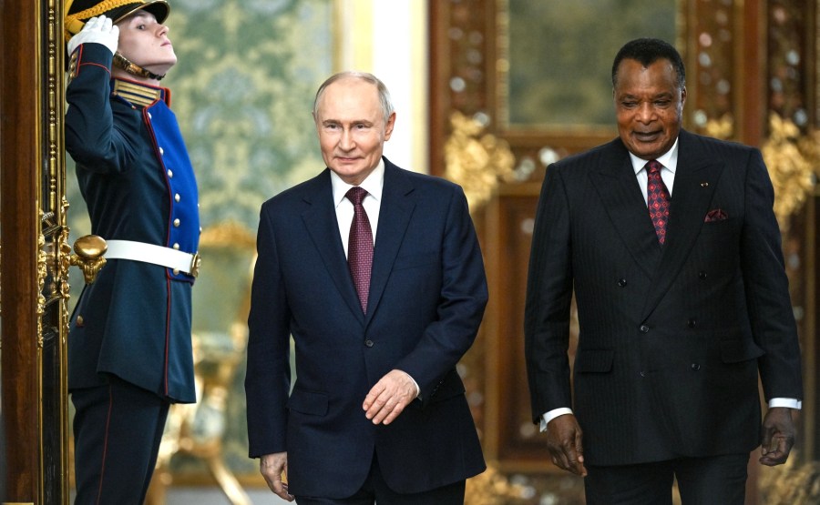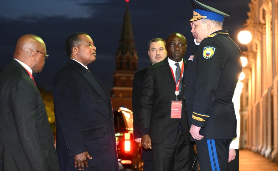 Le président de la République du Congo Denis Sassou Nguesso est arrivé au Kremlin pour rencontrer Vladimir Poutine. Avec le commandant du lieutenant-général du Kremlin Sergei Udovenko. Photo d’Alexandr Kryazhev, Ria Novosti