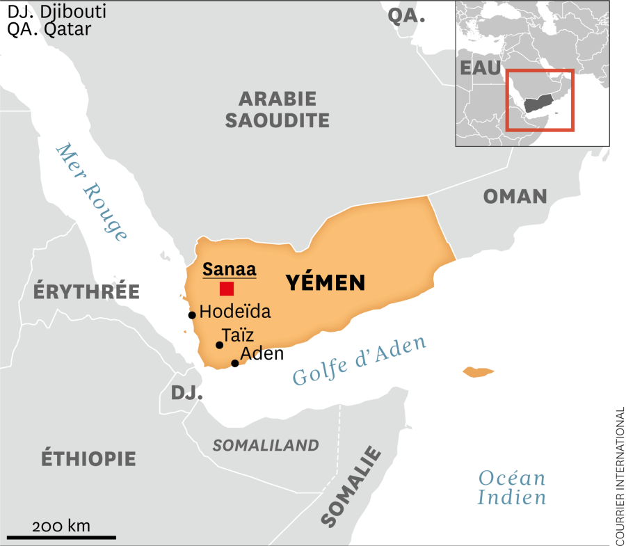 Carte du Yémen avec la capitale Sanaa et le port d’Hodeïda, contrôlés par les houthistes et attaqués par Israël les 5 et 6 mai 2025.. COURRIER INTERNATIONAL