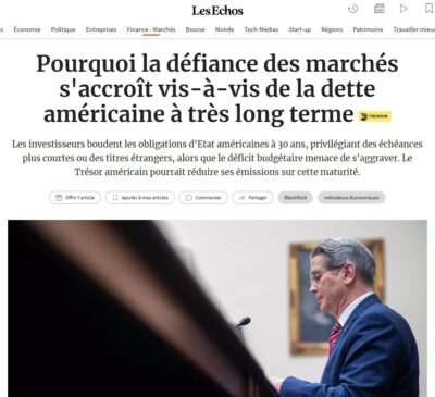 Les Echos, référénce de journalisme économique et financier en France, on s’inquiète également des taux et de l’envolée des durées les plus longues !