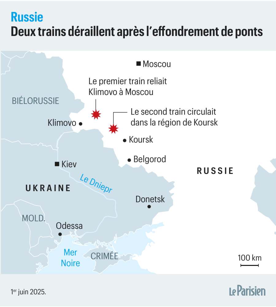 La première attaque a eu lieu le 31 mai 2025 à 22h33, au 43e kilomètre du tronçon Pilshino-Vygonichi de la ligne de chemin de fer de Moscou, dans la région de Briansk. Trois engins explosifs ont explosé, provoquant l’effondrement d’un viaduc routier au-dessus des voies ferrées.