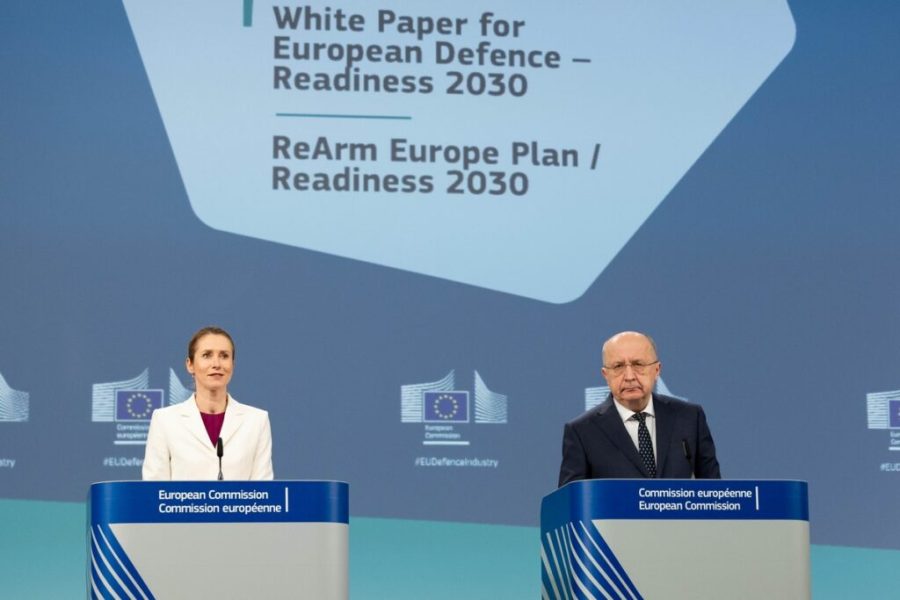 La nouvelle stratégie pour renforcer l’industrie de défense l’UE d’ici à 2030 a été dévoilée mercredi 19 mars 2025 par la haute représentante de l’UE pour les affaires étrangères et la politique de sécurité, Kaja Kallas (à gauche), et le commissaire européen à la défense, Andrius Kubilius (à droite) – Crédits : Jennifer Jacquemart / Commission européenne