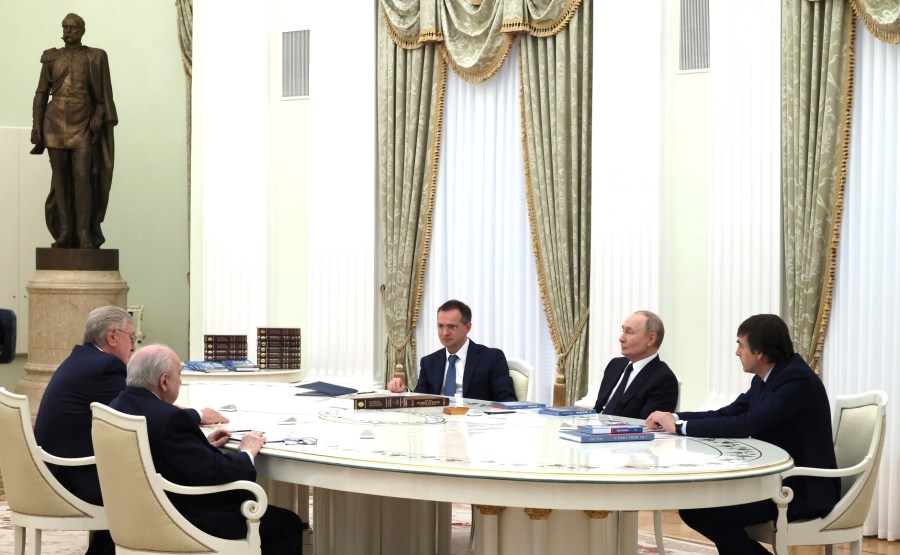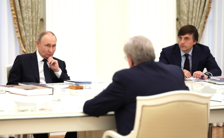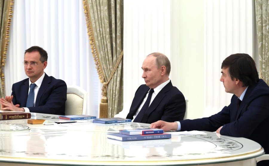 Lors d’une réunion avec les éditeurs de manuels d’histoire. Avec l’aide présidentielle Vladimir Medinsky. Photo: Mikhail Metzel, tass