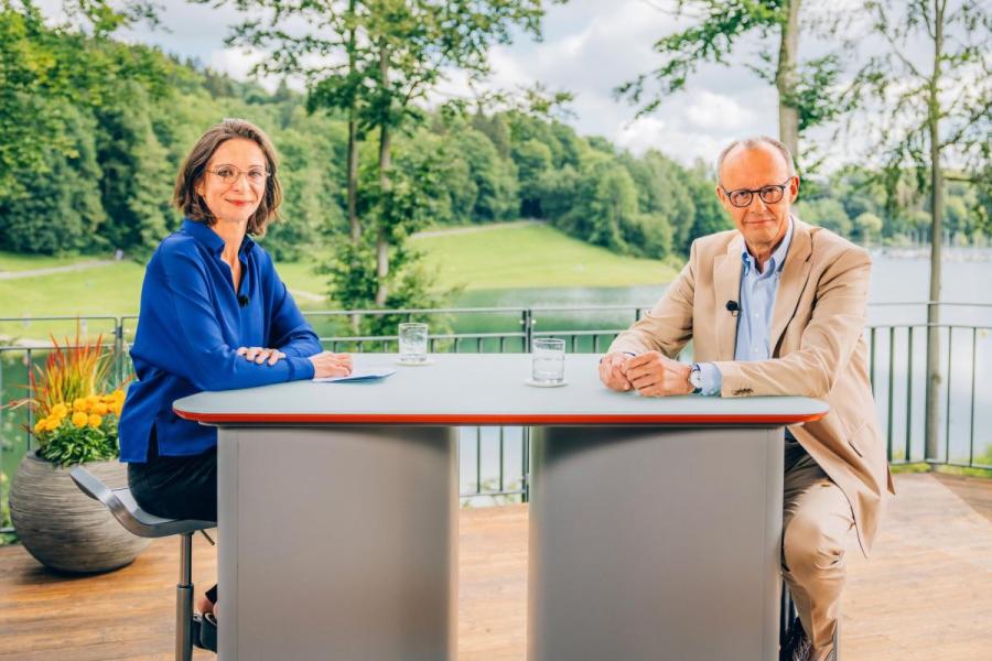 Diana Zimmermann, directrice du studio de la chaîne publique allemande ZDF & Friedrich Merz, actuel chancelier fédéral de la République fédérale d’Allemagne.