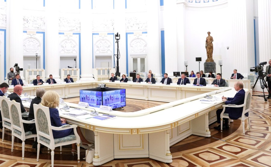 Au cours de la réunion sur le développement socioéconomique des républiques populaires de Donetsk et de Lugansk, les régions du Zaporozhye et de Kherson. Photo de Kristina Kormilitsyna («Rossiya Segodnya»)