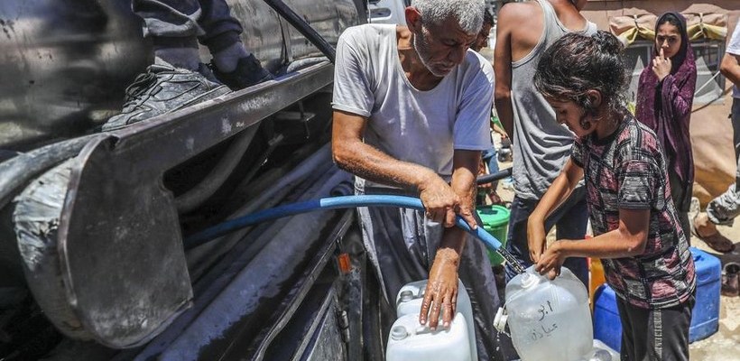 GAZA, 9 juillet – Des Palestiniens déplacés se procurent de l’eau près d’un abri temporaire dans la ville de Gaza, le 7 juillet 2025. (Crédit image: Xinhua/Mahmoud Zaki)